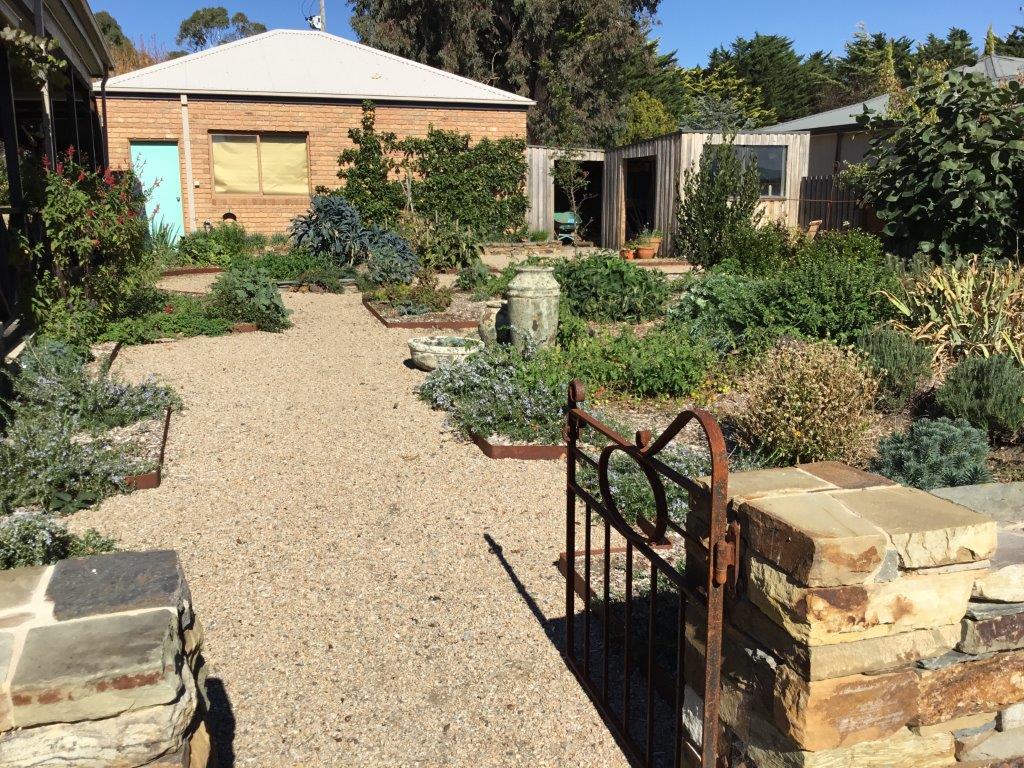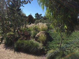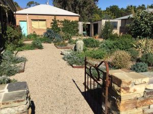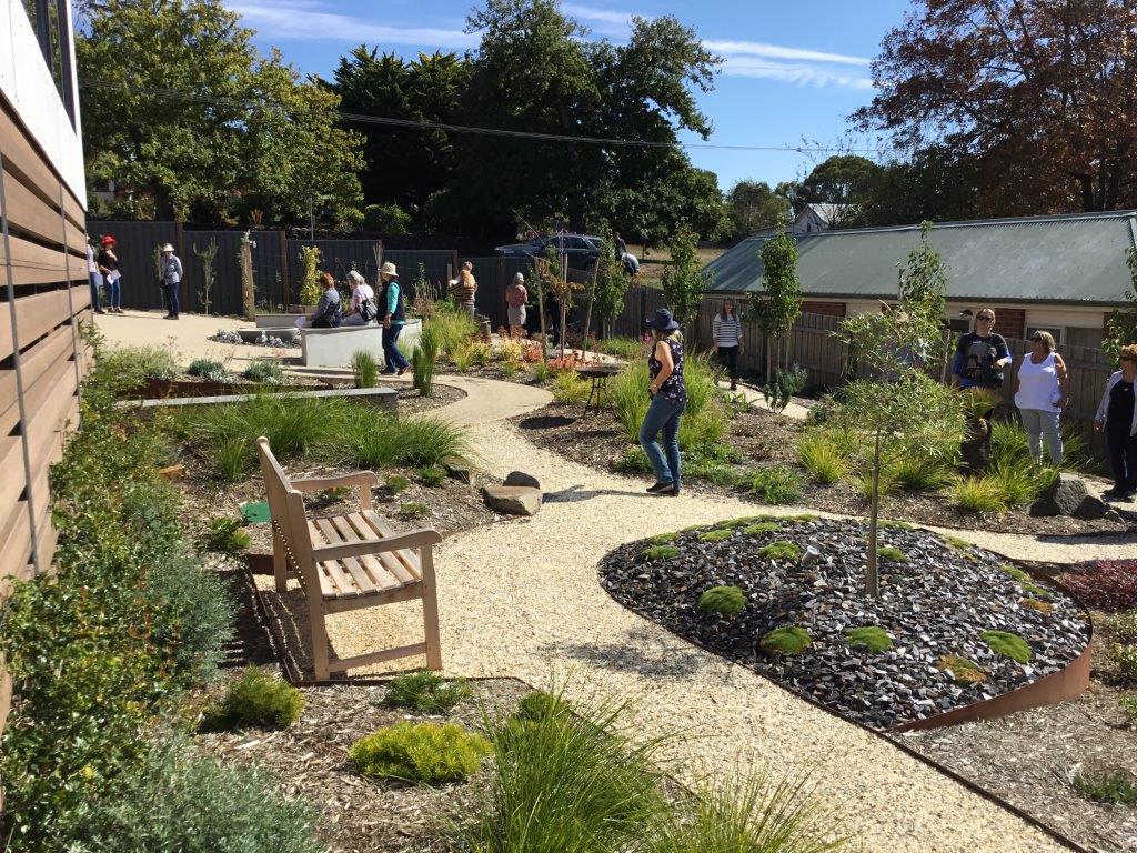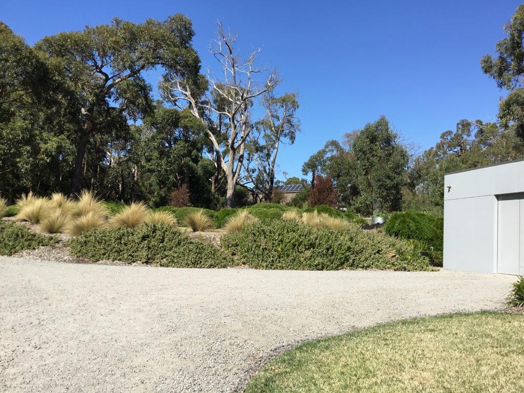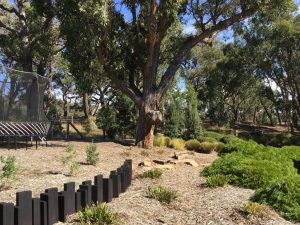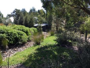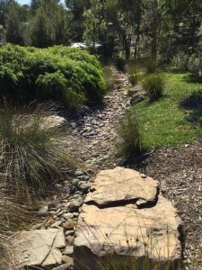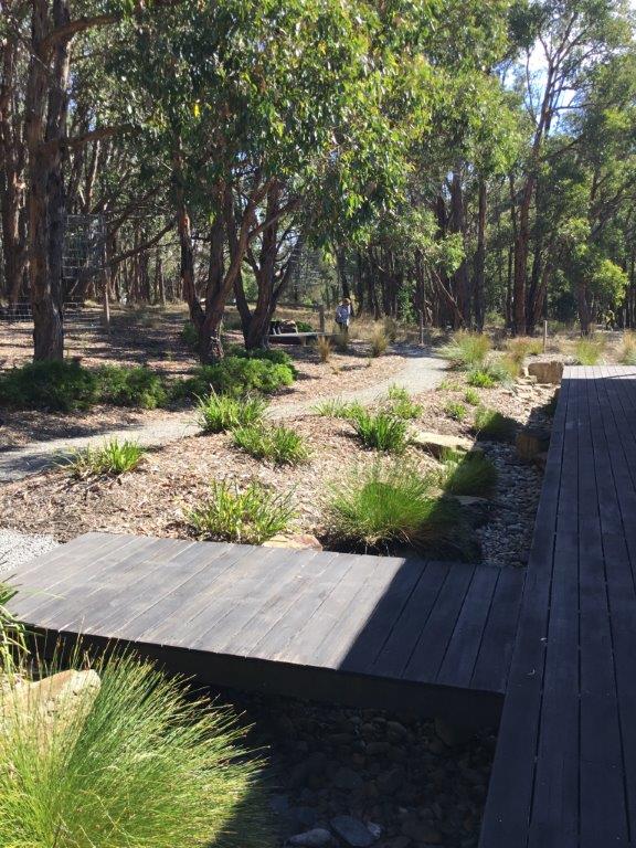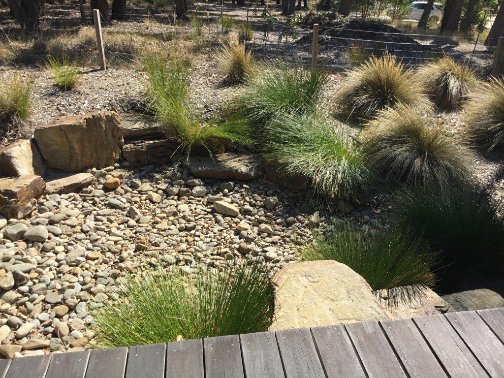 Kelly Gardens – Designed by Sue Meli Landscape Designs the brief for this garden was to retain and enhance the connection of the house to the natural surroundings of the adjacent bushland reserve. While still maintaining space for children to play and explore, the local fauna was also welcome to engage with the garden. Plantings used are native and with low maintenance and water requirements. Challenges included shallow top soil and a hard clay base, winter frosts, damaged soil profile following house construction, and rabbits.