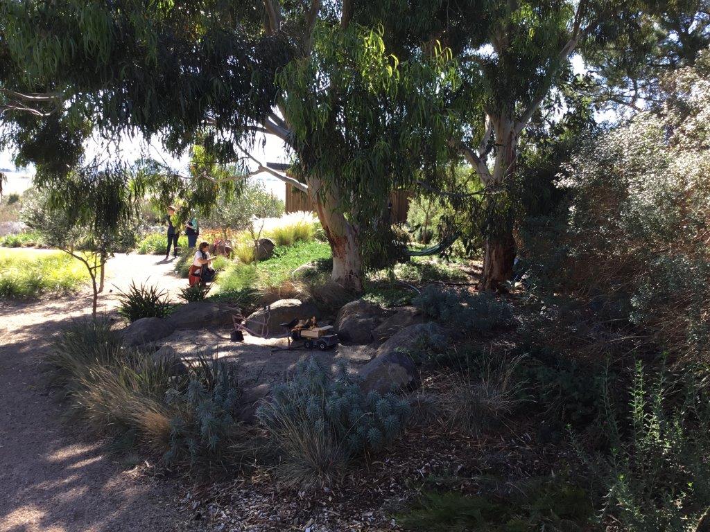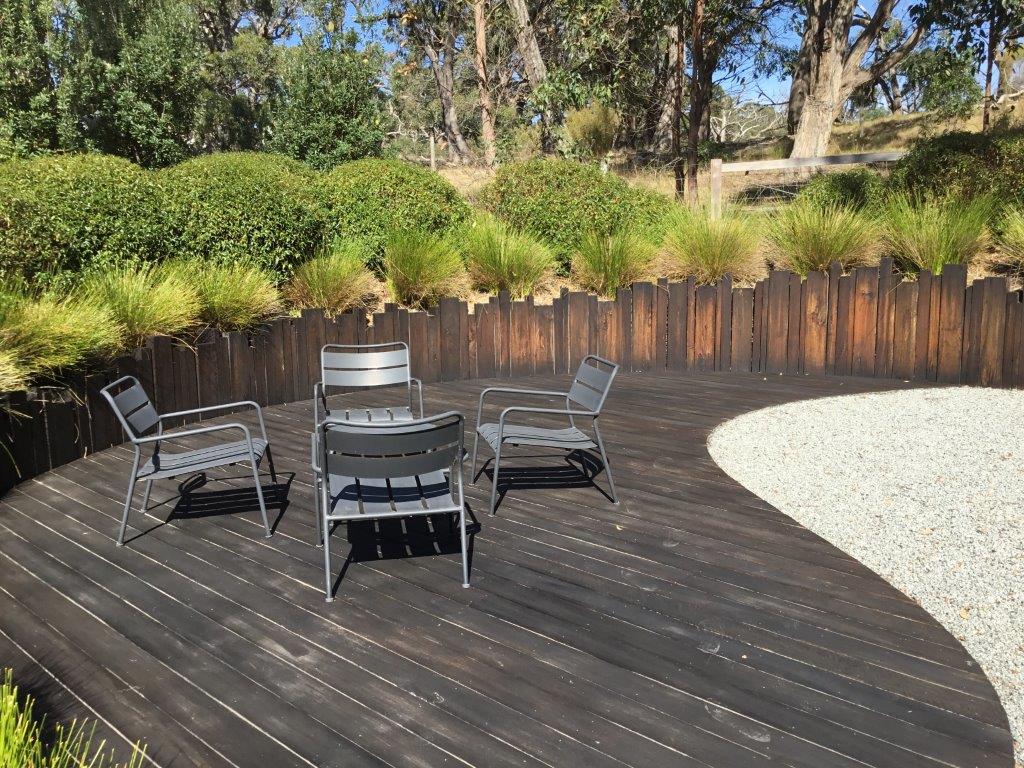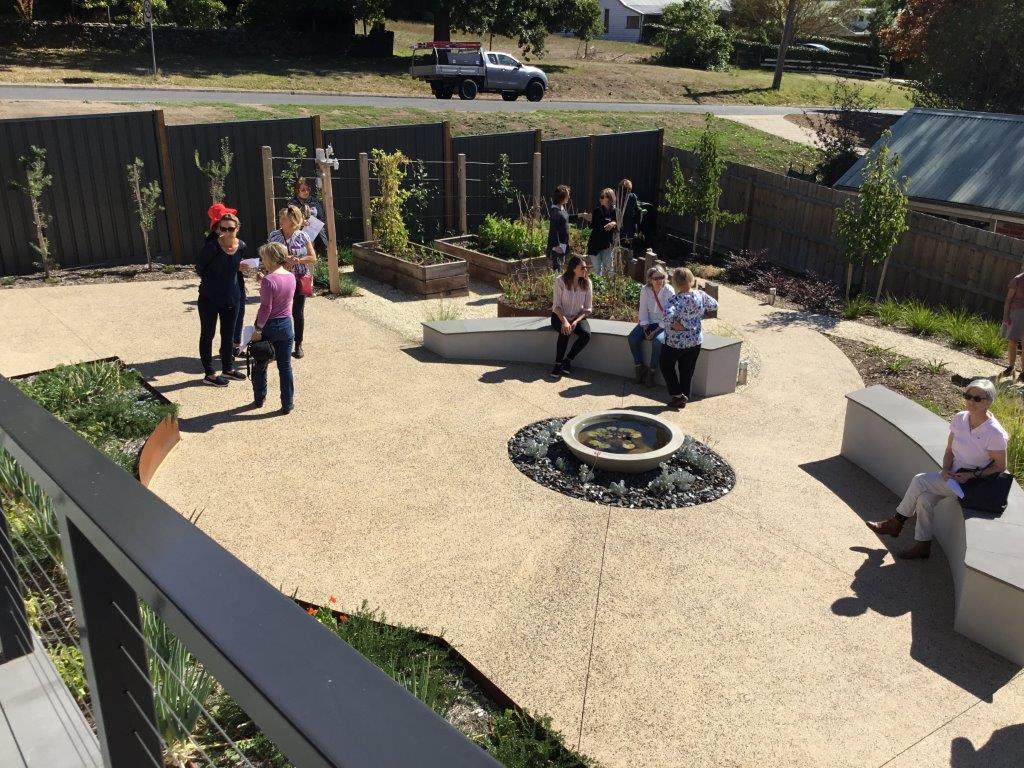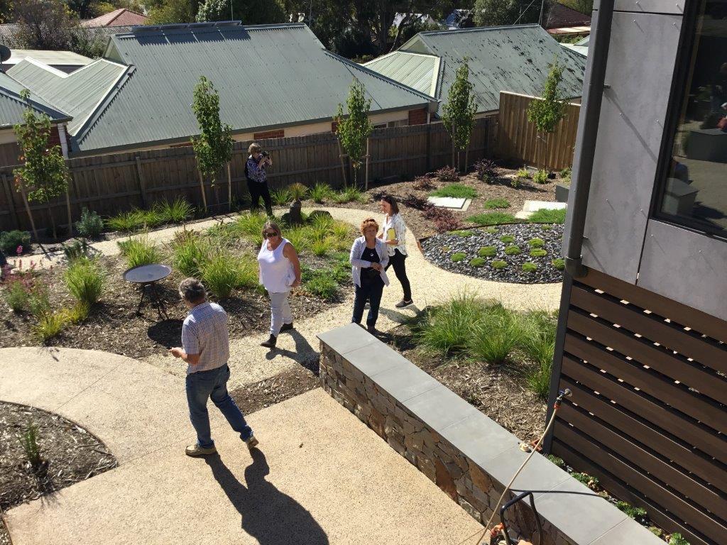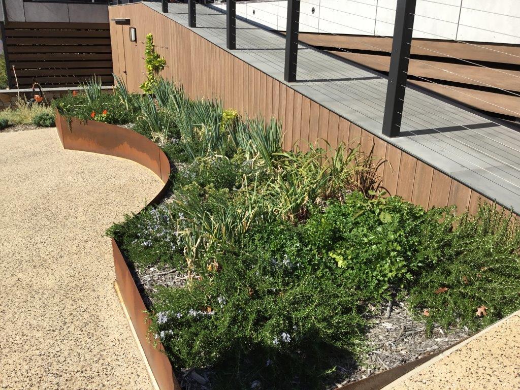 Kelly Gardens – Designed by Sue Meli Landscape Designs the brief for this garden was to retain and enhance the connection of the house to the natural surroundings of the adjacent bushland reserve. While still maintaining space for children to play and explore, the local fauna was also welcome to engage with the garden. Plantings used are native and with low maintenance and water requirements. Challenges included shallow top soil and a hard clay base, winter frosts, damaged soil profile following house construction, and rabbits.