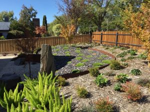 Aging in Place – This is a newly designed and planted garden (appx 1 year old). Again a difficult site due to sloping land, current owners wanted a space and garden that could be easily navigated as they grew older. This garden was designed by Kathleen Murphy Landscape Design, at the same time as the house was designed and built. Plants were all selected for their frost and drought tolerance.