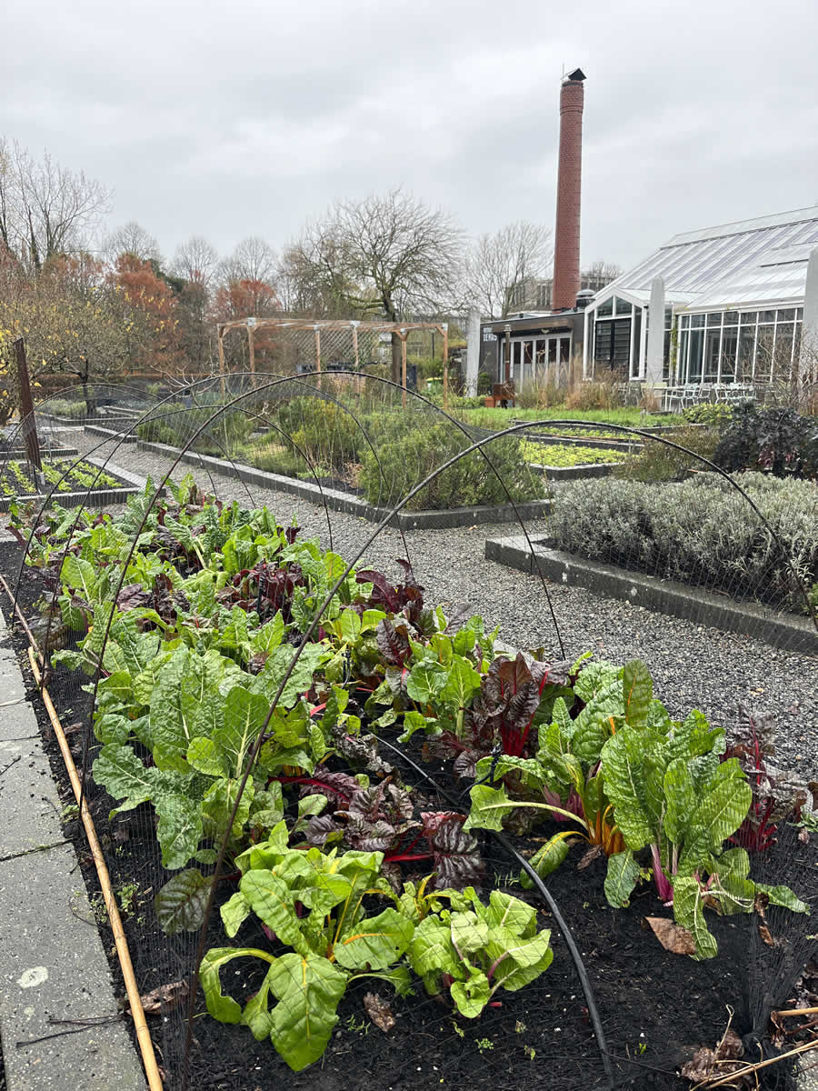 From a horticultural perspective, De Kas is a compelling example of productive garden design. The use of a greenhouse extends the growing season, supporting tender crops and seedlings, while larger seasonal vegetables are cultivated off-site in open fields. This combination reflects a thoughtful and sustainable growing system, where diversity and timing are key.