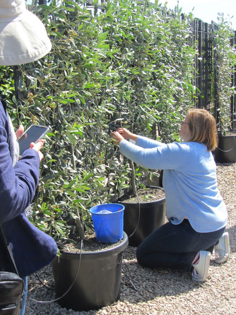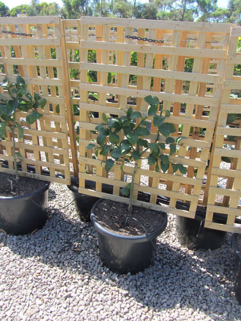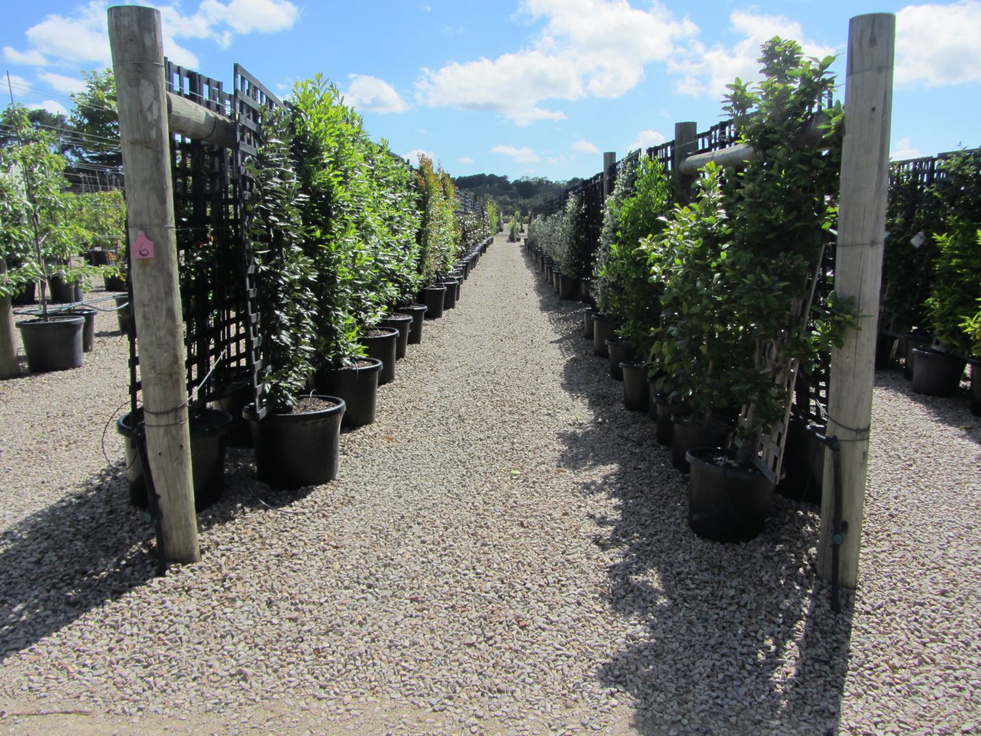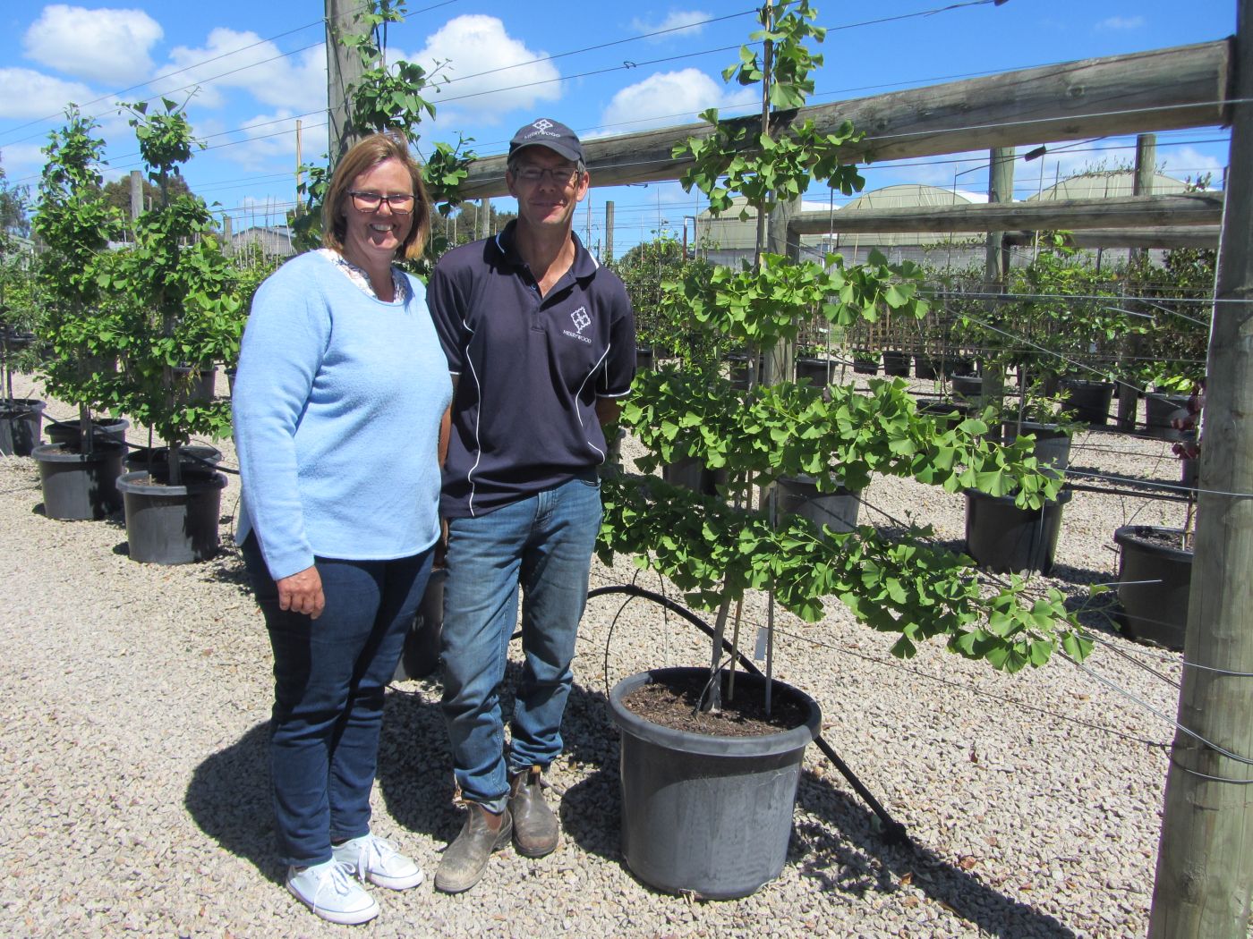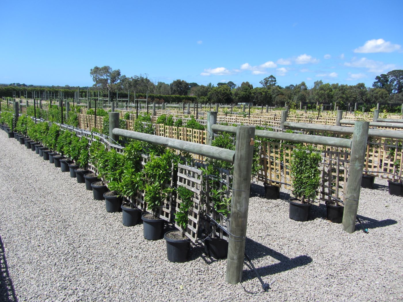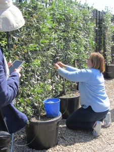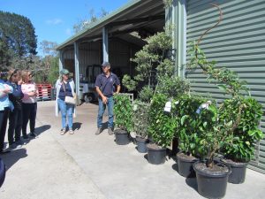 Jenny and Chris England, the husband and wife team who run Merrywood gave us a talk and tour of their espaliered plant business. We leant that from humble beginnings in the industry they rose to become the premier supplier of such plants in Australia. Guided by both Jenny and Chris we learnt the finer points of espaliering, from the initial plant specimen to the final saleable product. They are always trying out new species and a recent one of note was Ginkgo biloba, its unique foliage trained very elegantly.