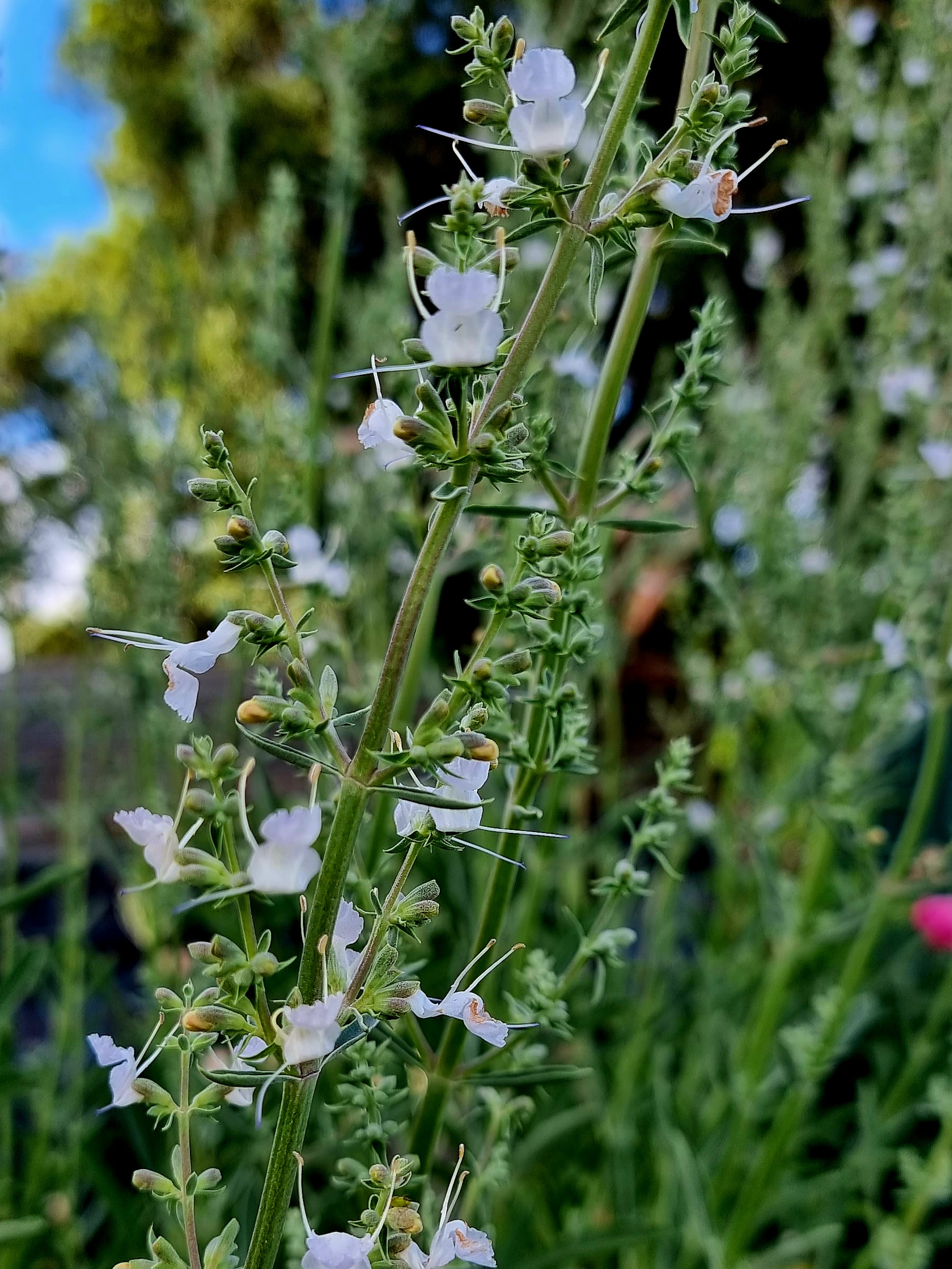 The second plant was a much bushier shape, a stronger more vigorous plant. But something didn’t feel right when I would go to plant it. I’d hold the pot and look around the garden and experience no urge to plunge the roots into the soil. So I’d put down the pot and walk away. After years of horticultural training, my gardening is now being led more by gut feeling and plant connection than strict learnings. I listen rather than tell. The roots found their own way into the soil, anchoring a half-toppled pot and causing the plant to redirect its growth to its new upward. We’ve all been there, or at least that’s what I tell myself. One Autumn morning the feeling changed. Today was the day. I overloaded my little car with a large stone pot and potting media and carefully transplanted the White Sage. The next three days were unseasonably warm and windy, and I watched my special plant suffer from transplant shock in unfavorable conditions. On day three I wrapped some bunched up netting around the plant to reduce the wind across the leaf surface. Conditions normalised and the roots settled, my tough friend made it through a Melbourne winter in its new home. The bushy form gave way to a slightly more sparse nature, heralding the coming of flower spikes. The spikes reached high, demanding your attention. Nectar rich white flowers adorn the crown of this wise plant, bees visiting and adding a hum of sound to the spectacle. Not a surprise when you consider the species name of apiana.
