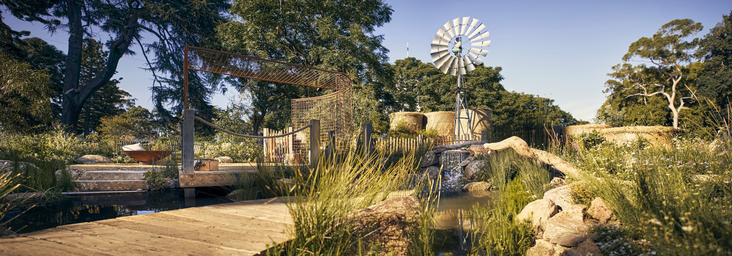 Our garden wasn’t the ordinary backyard setting, instead portraying an iconic Australian rural landscape, complete with a Comet windmill and two glass observation windows offering glimpses into the pond and soil. The aim was to unveil the concealed ecosystems beneath our feet, shedding light on their pivotal role in sustaining environmental health through healthy water, soil and planted environments.